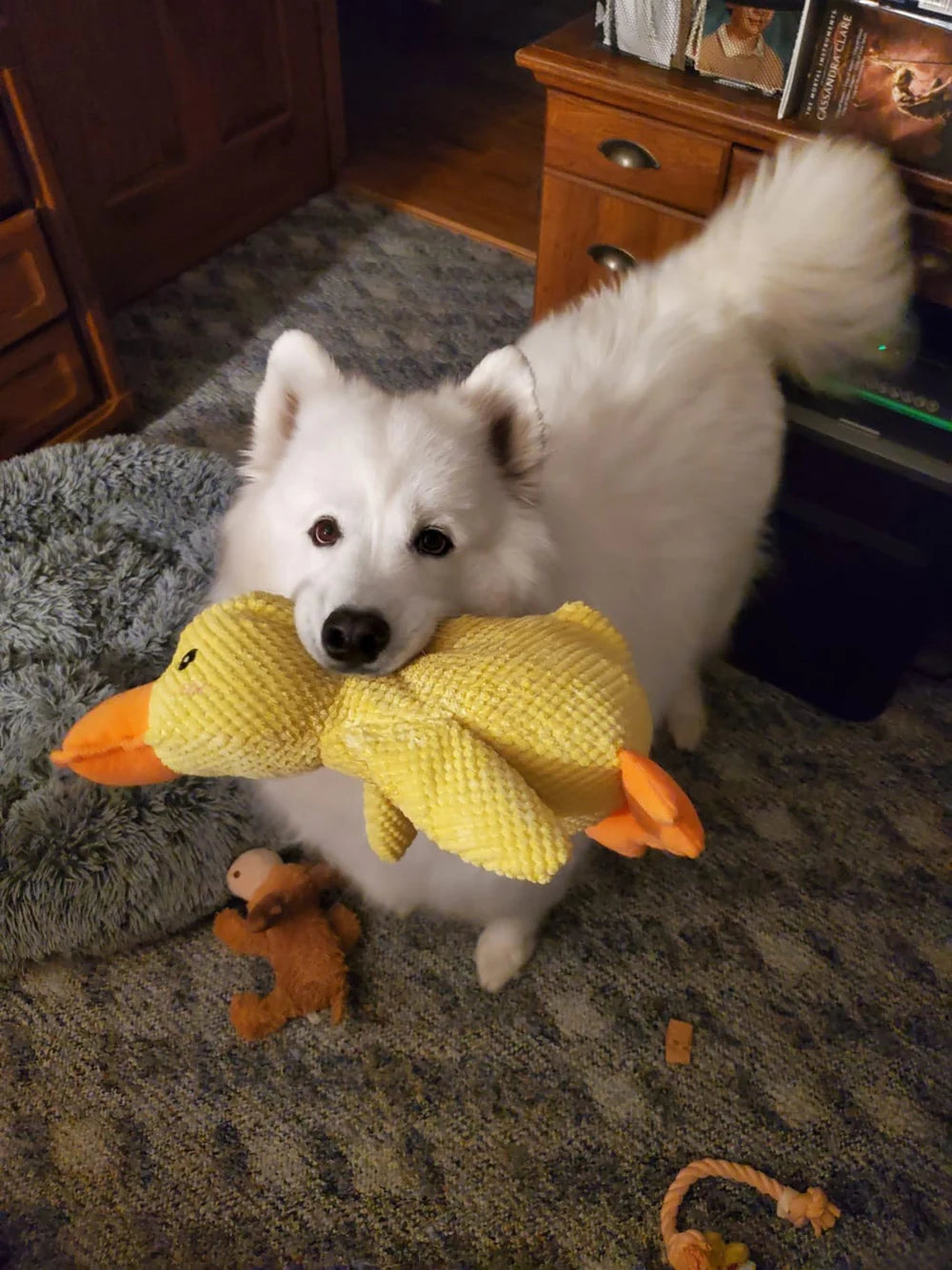 Ducky™ est fabriqué avec des matériaux résistants, parfait pour les chiens qui aiment mordre, mais il n’est pas indestructible.