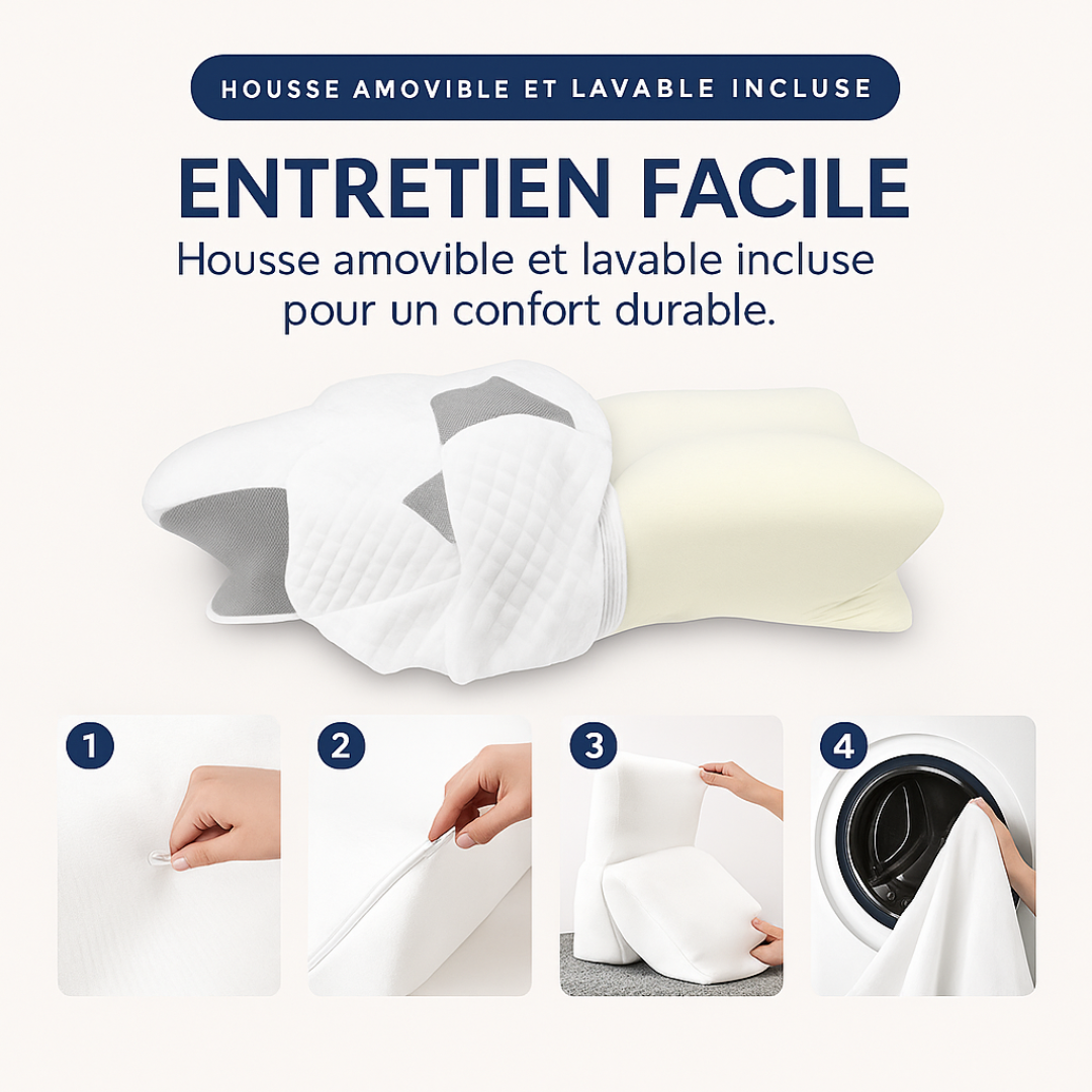 L’oreiller soutient la courbure naturelle des cervicales et aligne la colonne vertébrale durant le sommeil. Il permet ainsi de réduire les tensions musculaires et de prévenir les douleurs liées aux mauvaises postures nocturnes.