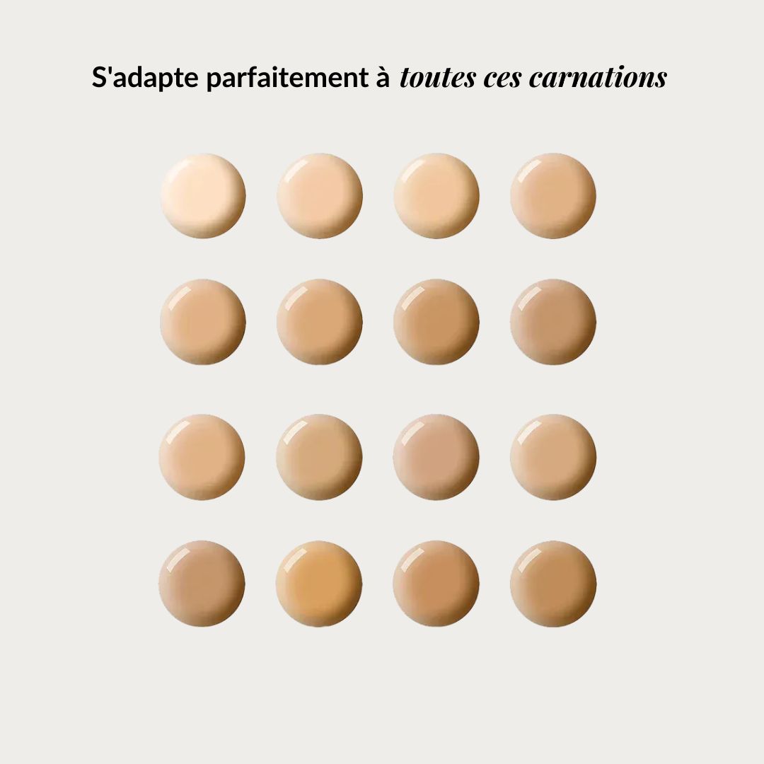 Notre fond de teint contient des pigments encapsulés qui s'activent au contact de la peau. En quelques secondes, la teinte se révèle et s’adapte parfaitement aux carnations claires à moyennes.